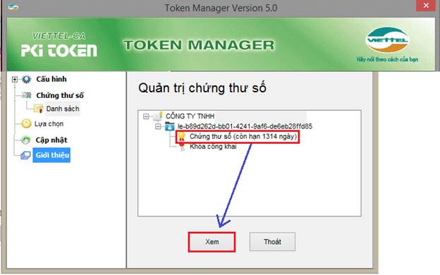Cách 1: Bạn có thể tra thời hạn trên phần mềm chữ ký số của Viettel. Bạn mở giao diện của USB token lên, nó hiện ra thì bạn chọn "Chứng Thư Số" ở bên cột trái, đánh mã PIN của bạn vào, sau đó nhìn sang cột phải và chọn tên doanh nghiệp, click vào XEM để biết chính xác thời hạn đến bao giờ.