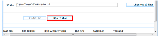Bước thứ 2, Dùng trình duyệt Internet Explorer, truy cập trang nhantokhai.gdt.gov.vn, đăng nhập vào hệ thống (chưa có tài khoản thì đăng ký), tìm danh mục NỘP TỜ KHAI -> nộp tờ khai -> thông báo hiện ra, chọn RUN -> Trong mục nộp hồ sơ khai thuế, ấn chọn tệp tờ khai để tìm cái file mình muốn nộp lên hệ thống (file phải là .PDF) -> OPEN